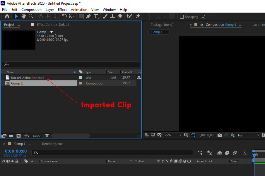 3. ویدیو یا صوت مورد نظرتون رو بگیرین و بکشین و توی تایم لاین “composition” تون رها کنین.