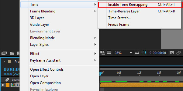 مرحله دوم: روی لایه کامپوزیشنتون کلیک راست کنین و روی گزینه Enable Time Remapping کلیک کنین.