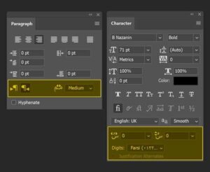 بعد، تو پنل Paragraph حالت Right-to-Left رو فعال کردیم تا موتور متن افترافکت ترتیب حروف فارسی رو درست درک کنه.